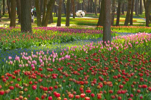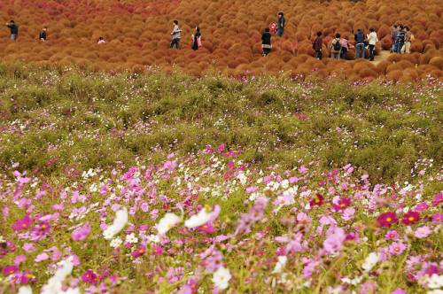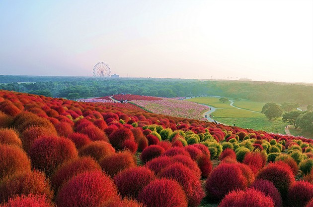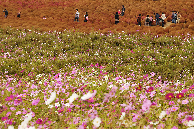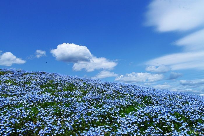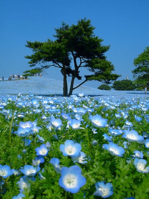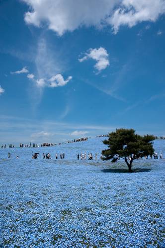 В буквальном переводе с японского Hitachi означает «рассвет». Японский национальный приморский парк Хитачи (Hitachi Seaside Park) расположен в префектуре Ибараки на о.Хонсю. Не так давно на месте парка были американские военные базы, земли которых в 1973 г. были переданы правительству Японии. В 1991 году небольшая часть парка (около 70 га) был открыта. В настоящее время парк расширился до 120 га и планирует расшириться до 350 га. В парке посажены целые поля различных цветов специально для проведения цветочных фестивалей: цветение уме и сакуры, тюльпанов, нарциссов, маков, лилий и конечно же немофилы (американской незабудки). Здесь есть зоопарк, луна-парк, бассейн и многое другое. Сюда любят приводить детей. Можно полюбоваться в парке Хитачи также роскошным цветением уме и сакуры. Во время фестиваля на 1000 деревьев сакуры вешают бумажные фонарики. И все же не в размерах заключается изюминка парка, который, кстати, во всем мире признан не совсем обычным. Дело в том, что в нем преимущественно произрастают не деревья и кустарники, как это в основном бывает в парках, а всевозможнейшие цветочные растения. Именно цветы составляют основу парка Хитачи, причем различные их виды цветут почти непрерывно, поэтапно сменяя друг друга. Среди них можно увидеть цветение тюльпанов и нарциссов, лилий и маков, а также многих других растений. Высаживаются они не на отдельных клумбах, а на огромных полях – одним словом, всегда представлены в таком невообразимом количестве, что создается впечатление, будто по земле разлилось цветочное море…