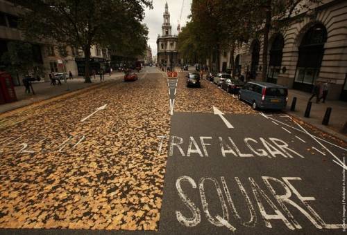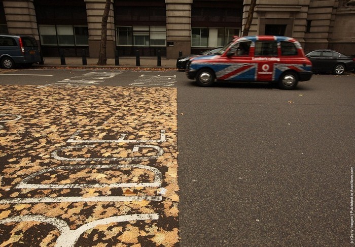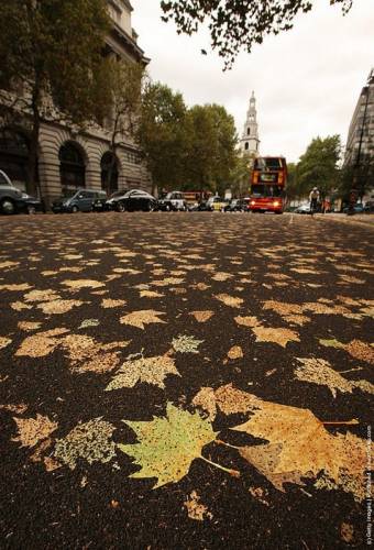 На первый взгляд кажется, что лондонскую дорогу разрисовал какой-то художник, который очень любит осень: улица аккуратно покрыта слоем листьев, неотделимых от асфальта. А между тем секрет дороги очень прост. Дорожные службы на днях вырезали в этом месте кусок старого асфальта и положили новый. Пока он был горячим и липким, на него напАдало множество осенних листьев. На следующий день, когда машины окончательно впечатали листья в дорогу, удивленные прохожие увидели невероятно кленовый асфальт.