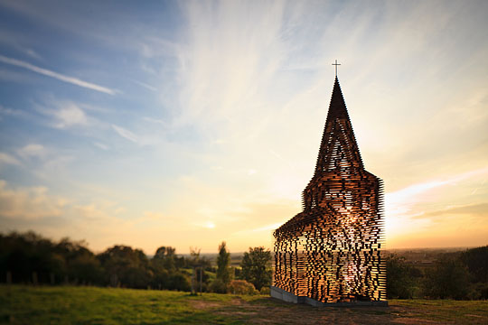 Арт-объект в форме церкви из деревянных реек построили на востоке Бельгии два молодых архитектора из студии Gijs van Vaerenbergh. Инсталляция сделана из 100 тонких планок, скрепленных стальными деталями. Между рейками оставлен большой промежуток, делающий конструкцию просвечивающей и изнутри, и снаружи. |
