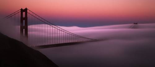 Летом туман в Сан-Франциско укутывает весь мегаполис плотным слоем. В это время особенно завораживающее зрелище представляет мост «Золотые ворота», который буквально парит как бы в облаках. Фотограф Теренс Чанга сумел запечатлеть уникальный природный феномен, сделав для этого снимки с длительной выдержкой. |